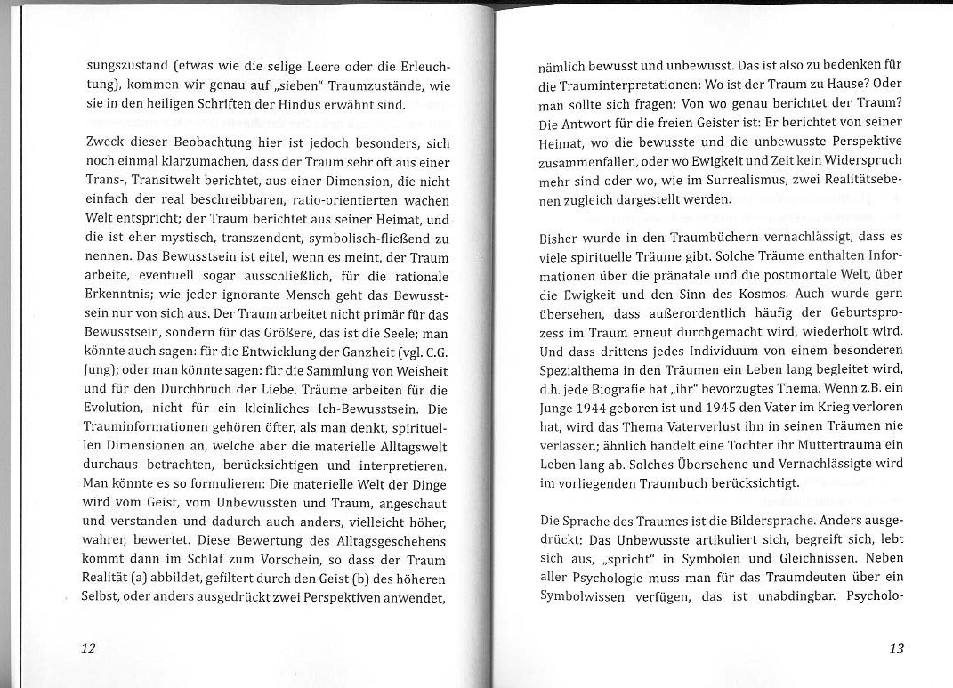 Tiefenpsychologie ist der Kern des Buches. Berücksichtigt werden aber auch die Parapsychologie und das Transzendente. So geht es also auch um Zukunftsträume, Jenseitsträume und die vorgeburtliche Zeit. Sigmund Freud und Carl Gustav Jung werden ausführlich dargestellt – neben dem Seitenblick auf das Spirituelle. Das Buch enthält die wichtigsten Suchbegriffe zum Traumgeschehen. Es ist ideal zum praktischen Nachschlagen; es ist lexikonartig aufgebaut. Insgesamt wird eine konzentrierte Information zum Grundverständnis der Träume geboten.