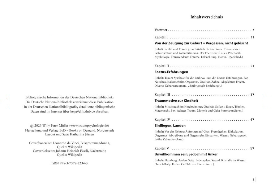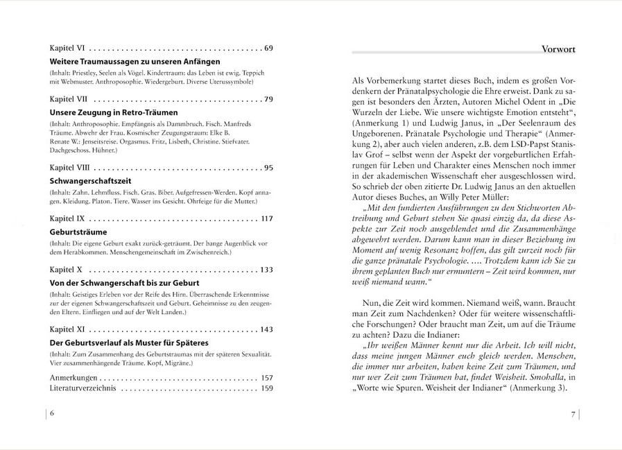 Immer wieder tauchen Erlebnisse aus der Uteruszeit in den späteren Träumen von Erwachsenen, Senioren, Kindern auf. Diese vorgeburtlichen Ereignisse können biografisch zurückverfolgt werden, sie beruhen auf Fakten. Die Pränatalpsychologie beschäftigt sich mit den charakterlichen Folgen solcher frühen Prägungen. Viele Beispiele dazu, als konkrete Retroträume, in diesem Buch.